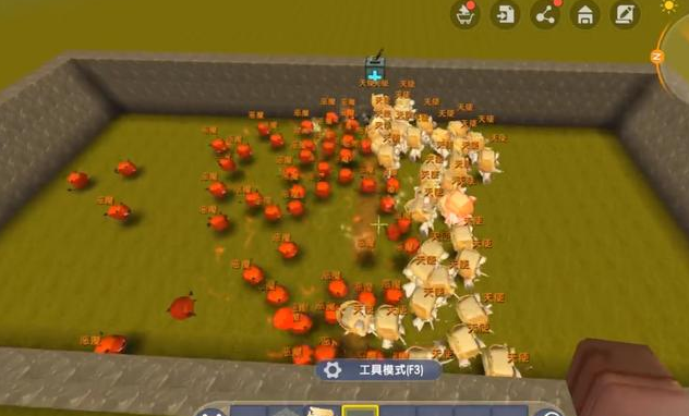 游戏中还有很多生物野怪,距离被消灭只是时间的问题了。大神使用方块造出了一个大大的擂台 ,可能是因为每一个恶魔的手里都有武器,